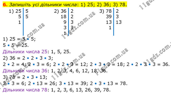 Запишіть усі дільники числа: 1) 25; 2) 36; 3) 78. 1) 25 = 5 • 5; 5 • 5 = 25. Дільники числа 25: 1, 5, 25. 2) 36 = 2 • 2 • 3 • 3; 2 • 2 = 4; 2 • 3 = 6; 2 • 2 • 3 = 12; 2 • 3 • 3 = 18; 2 • 2 • 3 • 3 = 36. Дільники числа 36: 1, 2, 3, 4, 6, 12, 18, 36. 3) 78 = 2 • 3 • 13; 2 • 3 = 6; 2 • 13 = 26; 3 • 13 = 39; 2 • 3 • 13 = 78. Дільники числа 78: 1, 2, 3, 6, 13, 26, 39, 78.