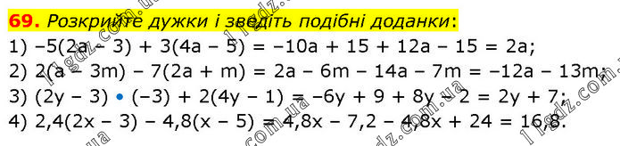 Розкрийте дужки і зведіть подібні доданки: 1) –5(2а – 3) + 3(4а – 5) = –10a + 15 + 12a – 15 = 2a; 2) 2(а – 3m) – 7(2а + m) = 2a – 6m – 14a – 7m = –12a – 13m; 3) (2у – 3) • (–3) + 2(4у – 1) = –6y + 9 + 8y – 2 = 2y + 7; 4) 2,4(2x – 3) – 4,8(х – 5) = 4,8x – 7,2 – 4,8x + 24 = 16,8.