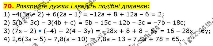 Розкрийте дужки і зведіть подібні доданки: 1) –4(3а – 2) + 6(2а – 1) = –12a + 8 + 12a – 6 = 2; 2) 5(b – 3c) – 3(4b + с) = 5b – 15c – 12b – 3c = –7b – 18c; 3) (7х – 2) • (–4) + 2(4 – 3y) = –28x + 8 + 8 – 6y = 16 – 28x – 6y; 4) 2,6(3а – 5) – 7,8(а – 10) = 7,8a – 13 – 7,8a + 78 = 65.