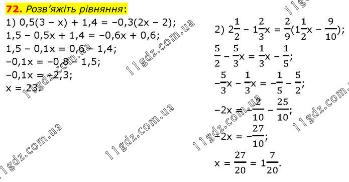 Розв’яжіть рівняння: 1) 0,5(3 – х) + 1,4 = –0,3(2х – 2); 1,5 – 0,5х + 1,4 = –0,6х + 0,6; 1,5 – 0,1х = 0,6 – 1,4; –0,1х = –0,8 – 1,5; –0,1х = –2,3; х = 23. 2) 21/2 – 12/3х = 2/9(11/2х – 9/10); 5/2 – 5/3х = 1/3х – 1/5; –5/3х – 1/3х = –1/5 – 5/2; –2х = –2/10 – 25/10; –2х = –27/10; х = 27/20 = 17/20.