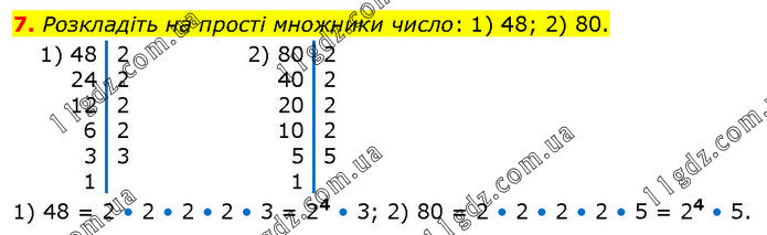 Розкладіть на прості множники число: 1) 48; 2) 80. 1) 48 = 2 • 2 • 2 • 2 • 3 = 24 • 3; 2) 80 = 2 • 2 • 2 • 2 • 5 = 24 • 5.