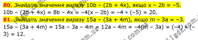 80. Знайдіть значення виразу 10b – (2b + 4х), якщо х – 2b = –5. 10b – (2b + 4х) = 8b – 4x = –4(x – 2b) = –4 • (–5) = 20. 81. Знайдіть значення виразу 15а – (За + 4m), якщо m – За = –3. 15а – (За + 4m) = 15a – 3a – 4m = 12a – 4m = –4(m – 3a) = (–4) • (–3) = 12.