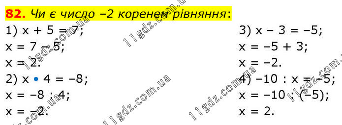 Чи є число –2 коренем рівняння: 1) х + 5 = 7; х = 7 – 5; х = 2. 2) х • 4 = –8; х = –8 : 4; х = –2. 3) х – 3 = –5; х = –5 + 3; х = –2. 4) –10 : х = –5; х = –10 : (–5); х = 2.