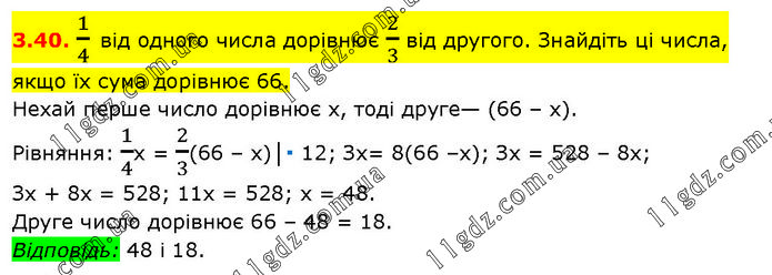 1/4 від одного числа дорівнює 2/3 від другого. Знайдіть ці числа, якщо їх сума дорівнює 66. Нехай перше число дорівнює х, тоді друге— (66 – х). Рівняння: 1/4х = 2/3(66 – х)│∙ 12; Зх= 8(66 –х); Зх = 528 – 8х; Зх + 8х = 528; 11x = 528; х = 48. Друге число дорівнює 66 – 48 = 18. Відповідь: 48 і 18.