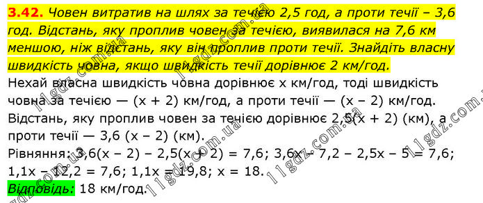 Човен витратив на шлях за течією 2,5 год, а проти течії – 3,6 год. Відстань, яку проплив човен за течією, виявилася на 7,6 км меншою, ніж відстань, яку він проплив проти течії. Знайдіть власну швидкість човна, якщо швидкість течії дорівнює 2 км/год. Нехай власна швидкість човна дорівнює х км/год, тоді швидкість човна за течією — (х + 2) км/год, а проти течії — (х – 2) км/год. Відстань, яку проплив човен за течією дорівнює 2,5(х + 2) (км), а проти течії — 3,6 (х – 2) (км). Рівняння: 3,6(х – 2) – 2,5(х + 2) = 7,6; 3,6х – 7,2 – 2,5х – 5 = 7,6; 1,1х – 12,2 = 7,6; 1,1x = 19,8; х = 18. Відповідь: 18 км/год.