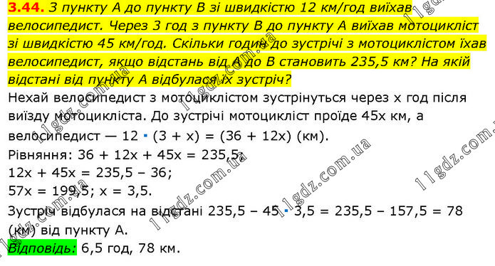 З пункту А до пункту В зі швидкістю 12 км/год виїхав велосипедист. Через 3 год з пункту В до пункту А виїхав мотоцикліст зі швидкістю 45 км/год. Скільки годин до зустрічі з мотоциклістом їхав велосипедист, якщо відстань від А до B становить 235,5 км? На якій відстані від пункту А відбулася їх зустріч? Нехай велосипедист з мотоциклістом зустрінуться через х год після виїзду мотоцикліста. До зустрічі мотоцикліст проїде 45х км, а велосипедист — 12 ∙ (3 + х) = (36 + 12х) (км). Рівняння: 36 + 12х + 45х = 235,5; 12х + 45x = 235,5 – 36; 57х = 199,5; х = 3,5. Зустріч відбулася на відстані 235,5 – 45 ∙ 3,5 = 235,5 – 157,5 = 78 (км) від пункту А. Відповідь: 6,5 год, 78 км.