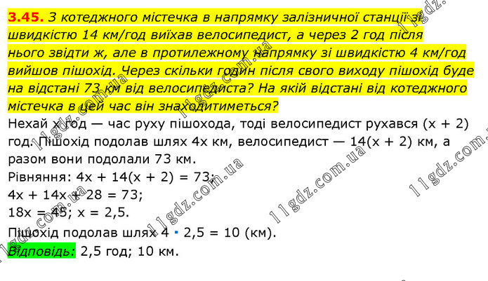 З котеджного містечка в напрямку залізничної станції зі швидкістю 14 км/год виїхав велосипедист, а через 2 год після нього звідти ж, але в протилежному напрямку зі швидкістю 4 км/год вийшов пішохід. Через скільки годин після свого виходу пішохід буде на відстані 73 км від велосипедиста? На якій відстані від котеджного містечка в цей час він знаходитиметься? Нехай х год — час руху пішохода, тоді велосипедист рухався (х + 2) год. Пішохід подолав шлях 4х км, велосипедист — 14(х + 2) км, а разом вони подолали 73 км. Рівняння: 4х + 14(х + 2) = 73; 4х + 14х + 28 = 73; 18х = 45; х = 2,5. Пішохід подолав шлях 4 ∙ 2,5 = 10 (км). Відповідь: 2,5 год; 10 км.