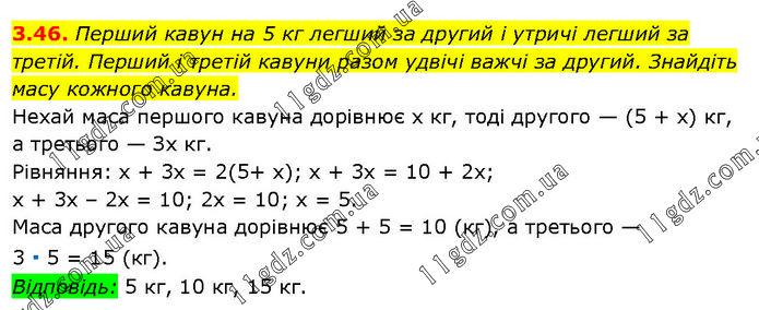 Перший кавун на 5 кг легший за другий і утричі легший за третій. Перший і третій кавуни разом удвічі важчі за другий. Знайдіть масу кожного кавуна. Нехай маса першого кавуна дорівнює х кг, тоді другого — (5 + х) кг, а третього — Зх кг. Рівняння: х + 3х = 2(5+ х); х + 3х = 10 + 2х; х + 3х – 2х = 10; 2х = 10; х = 5. Маса другого кавуна дорівнює 5 + 5 = 10 (кг), а третього — 3 ∙ 5 = 15 (кг). Відповідь: 5 кг, 10 кг, 15 кг.