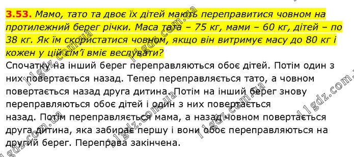Мамо, тато та двоє їх дітей мають переправитися човном на протилежний берег річки. Маса тата – 75 кг, мами – 60 кг, дітей – по 38 кг. Як їм скористатися човном, якщо він витримує масу до 80 кг і кожен у цій сім’ї вміє веслувати? Спочатку на інший берег переправляються обоє дітей. Потім один з них повертається назад. Тепер переправляється тато, а човном повертається назад друга дитина. Потім на інший берег знову переправляються обоє дітей і один з них повертається назад. Потім переправляється мама, а назад човном повертається друга дитина, яка забирає першу і вони обоє переправляються на другий берег. Переправа закінчена.
