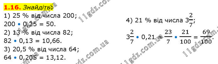 Знайдіть: 1) 25 % від числа 200; 200 • 0,25 = 50. 2) 13 % від числа 82; 82 • 0,13 = 10,66. 3) 20,5 % від числа 64; 64 • 0,205 = 13,12. 4) 21 % від числа 32/7; 32/7 • 0,21 = 23/7 • 21/100 = 69/100.