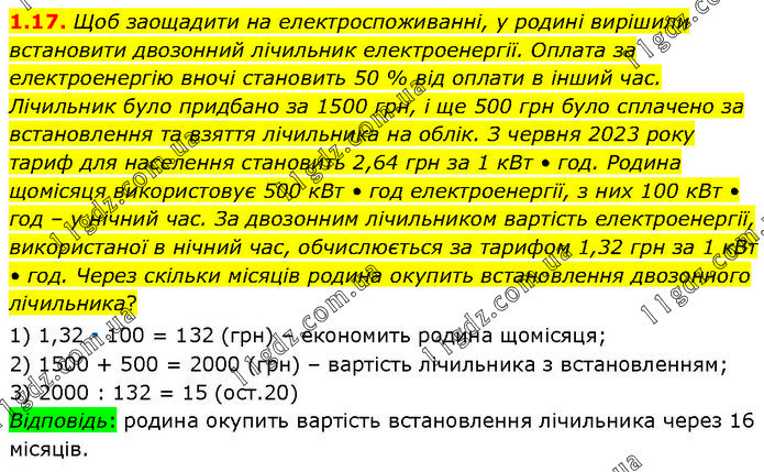 Щоб заощадити на електроспоживанні, у родині вирішили встановити двозонний лічильник електроенергії. Оплата за електроенергію вночі становить 50 % від оплати в інший час. Лічильник було придбано за 1500 грн, і ще 500 грн було сплачено за встановлення та взяття лічильника на облік. З червня 2023 року тариф для населення становить 2,64 грн за 1 кВт • год. Родина щомісяця використовує 500 кВт • год електроенергії, з них 100 кВт • год – у нічний час. За двозонним лічильником вартість електроенергії, використаної в нічний час, обчислюється за тарифом 1,32 грн за 1 кВт • год. Через скільки місяців родина окупить встановлення двозонного лічильника? 1) 1,32 ∙ 100 = 132 (грн) – економить родина щомісяця; 2) 1500 + 500 = 2000 (грн) – вартість лічильника з встановленням; 3) 2000 : 132 = 15 (ост.20) Відповідь: родина окупить вартість встановлення лічильника через 16 місяців.