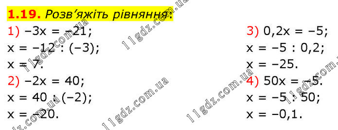 Розв’яжіть рівняння: 1) –3х = –21; х = –12 : (–3); х = 7. 2) –2х = 40; х = 40 : (–2); х = –20. 3) 0,2х = –5; х = –5 : 0,2; х = –25. 4) 50х = –5. х = –5 : 50; х = –0,1.