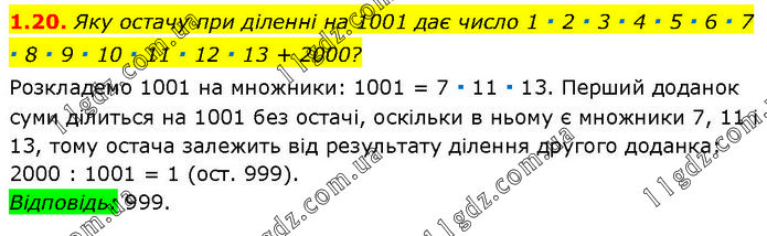 Яку остачу при діленні на 1001 дає число 1 ∙ 2 ∙ 3 ∙ 4 ∙ 5 ∙ 6 ∙ 7 ∙ 8 ∙ 9 ∙ 10 ∙ 11 ∙ 12 ∙ 13 + 2000? Розкладемо 1001 на множники: 1001 = 7 ∙ 11 ∙ 13. Перший доданок суми ділиться на 1001 без остачі, оскільки в ньому є множники 7, 11 і 13, тому остача залежить від результату ділення другого доданка: 2000 : 1001 = 1 (ост. 999). Відповідь: 999.