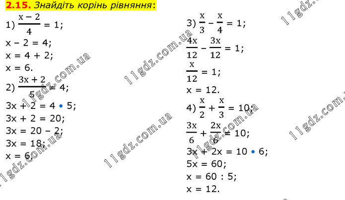 Знайдіть корінь рівняння: 1) (х - 2)/4 = 1; х – 2 = 4; х = 4 + 2; х = 6. 2) (3х + 2)/5 = 4; 3х + 2 = 4 • 5; 3х + 2 = 20; 3х = 20 – 2; 3х = 18; х = 6. 3) х/3 – х/4 = 1; 4х/12 – 3х/12 = 1; х/12 = 1; х = 12. 4) х/2 + х/3 = 10; 3х/6 + 2х/6 = 10; 3х + 2х = 10 • 6; 5х = 60; х = 60 : 5; х = 12.