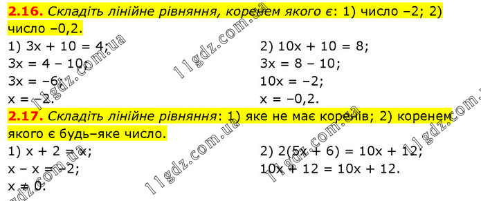 2.16. Складіть лінійне рівняння, коренем якого є: 1) число –2; 2) число –0,2. 1) 3х + 10 = 4; 3х = 4 – 10; 3х = –6; х = –2. 2) 10х + 10 = 8; 3х = 8 – 10; 10х = –2; х = –0,2. 2.17. Складіть лінійне рівняння: 1) яке не має коренів; 2) коренем якого є будь–яке число. 1) х + 2 = х; х – х = –2; х ≠ 0. 2) 2(5х + 6) = 10х + 12; 10х + 12 = 10х + 12.