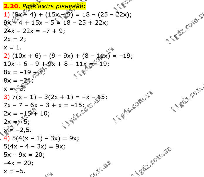 Розв’яжіть рівняння: 1) (9х – 4) + (15х – 5) = 18 – (25 – 22х); 9х – 4 + 15х – 5 = 18 – 25 + 22х; 24х – 22х = –7 + 9; 2х = 2; х = 1. 2) (10x + 6) – (9 – 9х) + (8 – 11x) = –19; 10х + 6 – 9 + 9х + 8 – 11х = –19; 8х = –19 – 5; 8х = –24; х = –3. 3) 7(х – 1) – 3(2х + 1) = –х – 15; 7х – 7 – 6х – 3 + х = –15; 2х = –15 + 10; 2х = –5; х = –2,5. 4) 5(4(х – 1) – Зх) = 9х; 5(4х – 4 – 3х) = 9х; 5х – 9х = 20; –4х = 20; х = –5.