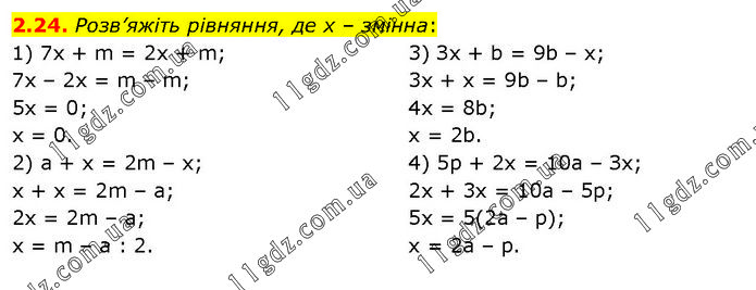 Розв’яжіть рівняння, де х – змінна: 1) 7x + m = 2х + m; 7x – 2x = m – m; 5x = 0; x = 0. 2) а + х = 2m – х; x + x = 2m – a; 2x = 2m – a; x = m – a : 2. 3) Зх + b = 9b – х; 3x + x = 9b – b; 4x = 8b; x = 2b. 4) 5р + 2х = 10a – Зх; 2x + 3x = 10a – 5p; 5x = 5(2a – p); x = 2a – p.
