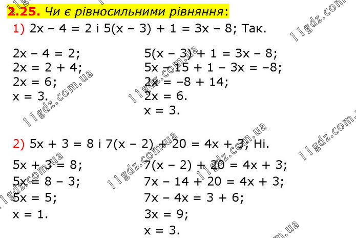 Чи є рівносильними рівняння: 1) 2х – 4 = 2 і 5(х – 3) + 1 = Зх – 8; Так. 2х – 4 = 2; 2х = 2 + 4; 2х = 6; х = 3. 5(х – 3) + 1 = Зх – 8; 5х – 15 + 1 – 3х = –8; 2х = –8 + 14; 2х = 6. х = 3. 2) 5х + 3 = 8 і 7(х – 2) + 20 = 4х + 3; Ні. 5х + 3 = 8; 5х = 8 – 3; 5х = 5; х = 1. 7(х – 2) + 20 = 4х + 3; 7х – 14 + 20 = 4х + 3; 7х – 4х = 3 + 6; 3х = 9; х = 3.