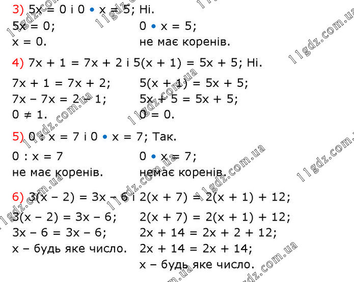 3) 5х = 0 і 0 • х = 5; Ні. 5х = 0; х = 0. 0 • х = 5; не має коренів. 4) 7x + 1 = 7x + 2 і 5(х + 1) = 5х + 5; Ні. 7x + 1 = 7x + 2; 7х – 7х = 2 – 1; 0 ≠ 1. 5(х + 1) = 5х + 5; 5х + 5 = 5х + 5; 0 = 0. 5) 0 : х = 7 і 0 • x = 7; Так. 0 : х = 7 не має коренів. 0 • x = 7; немає коренів. 6) 3(х – 2) = Зх – 6 і 2(х + 7) = 2(х + 1) + 12; 3(х – 2) = Зх – 6; 3х – 6 = 3х – 6; х – будь яке число. 2(х + 7) = 2(х + 1) + 12; 2х + 14 = 2х + 2 + 12; 2х + 14 = 2х + 14; х – будь яке число.