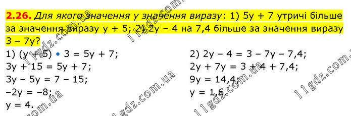 Для якого значення у значення виразу: 1) 5у + 7 утричі більше за значення виразу у + 5; 2) 2у – 4 на 7,4 більше за значення виразу 3 – 7у? 1) (у + 5) • 3 = 5у + 7; 3у + 15 = 5у + 7; 3у – 5у = 7 – 15; –2у = –8; у = 4. 2) 2у – 4 = 3 – 7у – 7,4; 2у + 7у = 3 + 4 + 7,4; 9у = 14,4; у = 1,6.