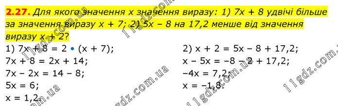 Для якого значення х значення виразу: 1) 7х + 8 удвічі більше за значення виразу х + 7; 2) 5х – 8 на 17,2 менше від значення виразу х + 2? 1) 7х + 8 = 2 • (х + 7); 7х + 8 = 2х + 14; 7х – 2х = 14 – 8; 5х = 6; х = 1,2. 2) х + 2 = 5х – 8 + 17,2; х – 5х = –8 – 2 + 17,2; –4х = 7,2; х = –1,8.