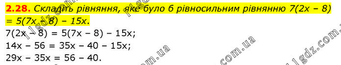 Складіть рівняння, яке було б рівносильним рівнянню 7(2х – 8) = 5(7х – 8) – 15х. 7(2х – 8) = 5(7х – 8) – 15х; 14х – 56 = 35х – 40 – 15х; 29х – 35х = 56 – 40.
