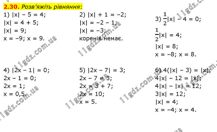 Розв’яжіть рівняння: 1) |x| – 5 = 4; |x| = 4 + 5; |x| = 9; x = –9; x = 9. 2) |x| + 1 = –2; |x| = –2 – 1; |x| = –3; коренів немає. 3) 1/2|x| – 4 = 0; 1/2|x| = 4; |x| = 8; x = –8; x = 8. 4) |2x – 1| = 0; 2x – 1 = 0; 2x = 1; x = 0,5. 5) |2x – 7| = 3; 2x – 7 = 3; 2x = 3 + 7; 2x = 10; x = 5. 6) 4(|x| – 3) = |x|; 4|x| – 12 = |x|; 4|x| – |x| = 12; 3|x| = 12; |x| = 4; x = –4; x = 4.