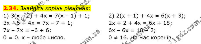 Знайдіть корінь рівняння: 1) 3(x – 2) + 4х = 7(х – 1) + 1; 3х – 6 + 4х = 7х – 7 + 1; 7х – 7х = –6 + 6; 0 = 0. х – любе число. 2) 2(х + 1) + 4х = 6(х + 3); 2х + 2 + 4х = 6х + 18; 6х – 6х = 18 – 2; 0 ≠ 16. Не має коренів.
