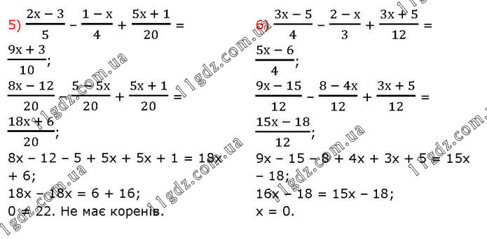 5) (2х - 3)/5 – (1 - х)/4 + (5х + 1)/20 = (9х + 3)/10; (8х - 12)/20 – (5 - 5х)/20 + (5х + 1)/20 = (18х + 6)/20; 8х – 12 – 5 + 5х + 5х + 1 = 18х + 6; 18х – 18х = 6 + 16; 0 ≠ 22. Не має коренів. 6) (3х - 5)/4 – (2 - х)/3 + (3х + 5)/12 = (5х - 6)/4; (9х - 15)/12 – (8 - 4х)/12 + (3х + 5)/12 = (15х - 18)/12; 9х – 15 – 8 + 4х + 3х + 5 = 15х – 18; 16х – 18 = 15х – 18; х = 0.
