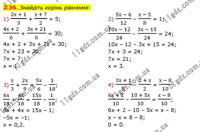 Знайдіть корінь рівняння: 1) (2х + 1)/3 + (х + 7)/2 = 5; (4х + 2)/6 + (3х + 21)/6 = 30; 4х + 2 + 3х + 21 = 30; 7х + 23 = 30; 7х = 7; х = 1. 2) (5х - 6)/12 – (х - 5)/8 = 1; (10х - 12)/24 – (3х - 15)/24 = 24; 10х – 12 – 3х + 15 = 24; 7х + 3 = 24; 7х = 21; х = 3. 3) х/3 + 2х/9 = 5х/6 – 1/18; 6х/18 + 4х/18 = 15х/18 – 1/18; 6х + 4х = 15х – 1; –5х = –1; х = 0,2. 4) (3х + 1)/5 – (2 + х)/2 = (х - 8)/10; (6х + 2)/10 – (10 + 5х)/10 = (х - 8)/10; 6х + 2 – 10 – 5х = х – 8; х – х = 8 – 8; 0 = 0.