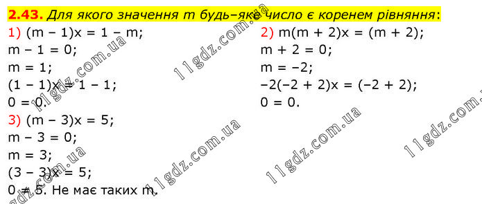 Для якого значення m будь–яке число є коренем рівняння: 1) (m – 1)х = 1 – m; m – 1 = 0; m = 1; (1 – 1)x = 1 – 1; 0 = 0. 2) m(m + 2)х = (m + 2); m + 2 = 0; m = –2; –2(–2 + 2)x = (–2 + 2); 0 = 0. 3) (m – 3)х = 5; m – 3 = 0; m = 3; (3 – 3)x = 5; 0 ≠ 5. Не має таких m.