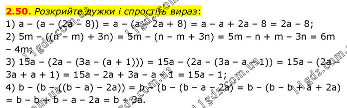 Розкрийте дужки і спростіть вираз: 1) а – (а – (2а – 8)) = a – (a – 2a + 8) = a – a + 2a – 8 = 2a – 8; 2) 5m – ((n – m) + Зn) = 5m – (n – m + 3n) = 5m – n + m – 3n = 6m – 4m; 3) 15а – (2а – (За – (а + 1))) = 15a – (2a – (3a – a – 1)) = 15a – (2a – 3a + a + 1) = 15a – 2a + 3a – a – 1 = 15a – 1; 4) b – (b – ((b – а) – 2а)) = b – (b – (b – a – 2a) = b – (b – b + a + 2a) = b – b + b – a – 2a = b – 3a.
