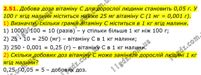Добова доза вітаміну C для дорослої людини становить 0,05 г. У 100 г ягід малини міститься майже 25 мг вітаміну C (1 мг = 0,001 г). 1) Визначте, скільки грамів вітаміну C міститься в 1 кг ягід малини. 1) 1000 : 100 = 10 (разів) – у стільки більше 1 кг ніж 100 г; 2) 25 ∙ 10 = 250 (мг) – вітаміну С в 1 кг малини; 3) 250 ∙ 0,001 = 0,25 (г) – вітаміну С в 1 кг малини. 2) Скільки добових доз вітаміну C може замінити дорослій людині 1 кг ягід малини? 0,25 : 0,05 = 5 – добових доз.