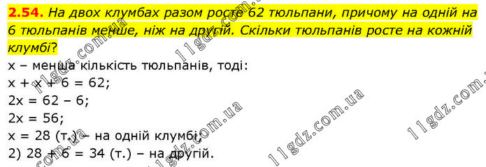 На двох клумбах разом росте 62 тюльпани, причому на одній на 6 тюльпанів менше, ніж на другій. Скільки тюльпанів росте на кожній клумбі? х – менша кількість тюльпанів, тоді: х + х + 6 = 62; 2х = 62 – 6; 2х = 56; х = 28 (т.) – на одній клумбі; 2) 28 + 6 = 34 (т.) – на другій.