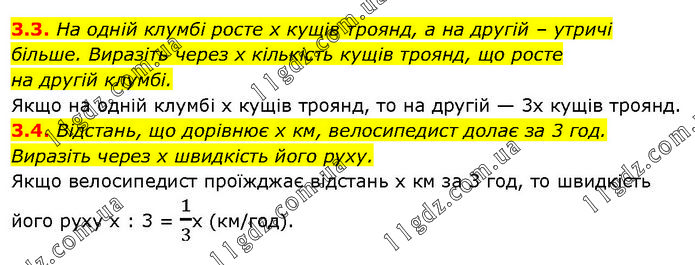 3.3. На одній клумбі росте х кущів троянд, а на другій – утричі більше. Виразіть через х кількість кущів троянд, що росте на другій клумбі. Якщо на одній клумбі x кущів троянд, то на другій — 3x кущів троянд. 3.4. Відстань, що дорівнює х км, велосипедист долає за 3 год. Виразіть через х швидкість його руху. Якщо велосипедист проїжджає відстань x км за 3 год, то швидкість його руху х : 3 = 1/3x (км/год).