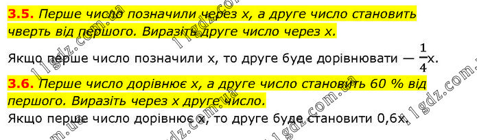 3.5. Перше число позначили через х, а друге число становить чверть від першого. Виразіть друге число через х. Якщо перше число позначили x, то друге буде дорівнювати — 1/4х. 3.6. Перше число дорівнює х, а друге число становить 60 % від першого. Виразіть через х друге число. Якщо перше число дорівнює х, то друге буде становити 0,6х.