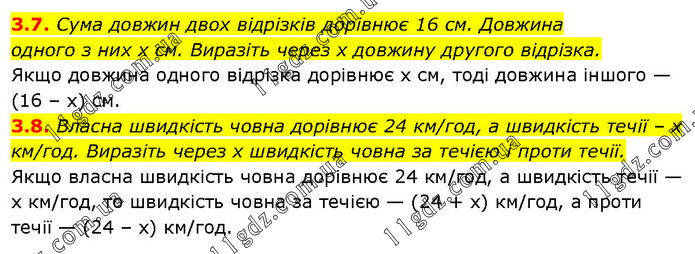 3.7. Сума довжин двох відрізків дорівнює 16 см. Довжина одного з них х см. Виразіть через х довжину другого відрізка. Якщо довжина одного відрізка дорівнює х см, тоді довжина іншого — (16 – х) см. 3.8. Власна швидкість човна дорівнює 24 км/год, а швидкість течії – х км/год. Виразіть через х швидкість човна за течією і проти течії. Якщо власна швидкість човна дорівнює 24 км/год, а швидкість течії — х км/год, то швидкість човна за течією — (24 + х) км/год, а проти течії — (24 – х) км/год.