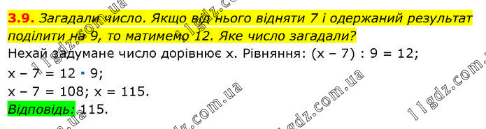 Загадали число. Якщо від нього відняти 7 і одержаний результат поділити на 9, то матимемо 12. Яке число загадали? Нехай задумане число дорівнює х. Рівняння: (х – 7) : 9 = 12; х – 7 = 12 ∙ 9; х – 7 = 108; х = 115. Відповідь: 115.