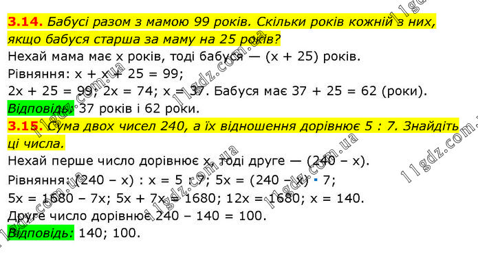 3.14. Бабусі разом з мамою 99 років. Скільки років кожній з них, якщо бабуся старша за маму на 25 років? Нехай мама має х років, тоді бабуся — (х + 25) років. Рівняння: х + х + 25 = 99; 2х + 25 = 99; 2х = 74; х = 37. Бабуся має 37 + 25 = 62 (роки). Відповідь: 37 років і 62 роки. 3.15. Сума двох чисел 240, а їх відношення дорівнює 5 : 7. Знайдіть ці числа. Нехай перше число дорівнює х, тоді друге — (240 – х). Рівняння: (240 – х) : х = 5 : 7; 5х = (240 – х) ∙ 7; 5х = 1680 – 7х; 5х + 7х = 1680; 12х = 1680; х = 140. Друге число дорівнює 240 – 140 = 100. Відповідь: 140; 100.