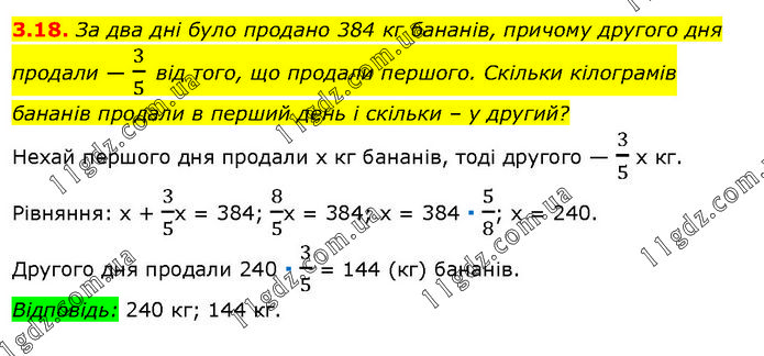 За два дні було продано 384 кг бананів, причому другого дня продали — 3/5 від того, що продали першого. Скільки кілограмів бананів продали в перший день і скільки – у другий? Нехай першого дня продали х кг бананів, тоді другого — 3/5 х кг. Рівняння: х + 3/5х = 384; 8/5х = 384; х = 384 ∙ 5/8; х = 240. Другого дня продали 240 ∙ 3/5 = 144 (кг) бананів. Відповідь: 240 кг; 144 кг.