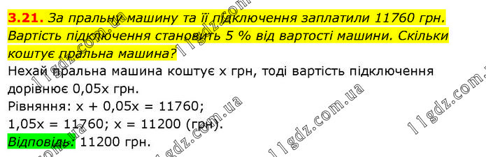 За пральну машину та її підключення заплатили 11760 грн. Вартість підключення становить 5 % від вартості машини. Скільки коштує пральна машина? Нехай пральна машина коштує х грн, тоді вартість підключення дорівнює 0,05х грн. Рівняння: х + 0,05х = 11760; 1,05x = 11760; х = 11200 (грн). Відповідь: 11200 грн.