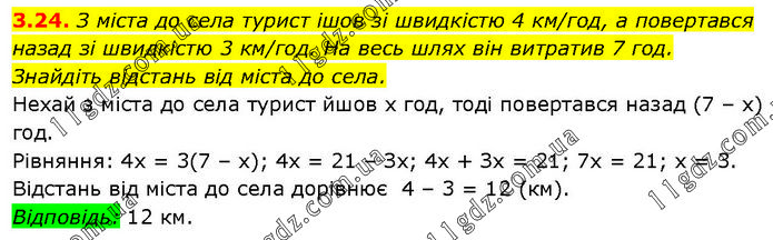 З міста до села турист ішов зі швидкістю 4 км/год, а повертався назад зі швидкістю 3 км/год. На весь шлях він витратив 7 год. Знайдіть відстань від міста до села. Нехай з міста до села турист йшов х год, тоді повертався назад (7 – х) год. Рівняння: 4х = 3(7 – х); 4х = 21 – Зх; 4х + Зх = 21; 7х = 21; х = 3. Відстань від міста до села дорівнює 4 – 3 = 12 (км). Відповідь: 12 км.