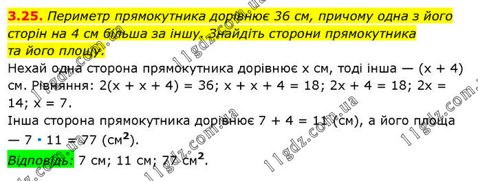 Периметр прямокутника дорівнює 36 см, причому одна з його сторін на 4 см більша за іншу. Знайдіть сторони прямокутника та його площу. Нехай одна сторона прямокутника дорівнює х см, тоді інша — (х + 4) см. Рівняння: 2(х + х + 4) = 36; х + х + 4 = 18; 2х + 4 = 18; 2х = 14; х = 7. Інша сторона прямокутника дорівнює 7 + 4 = 11 (см), а його площа — 7 ∙ 11 = 77 (см2). Відповідь: 7 см; 11 см; 77 см2.