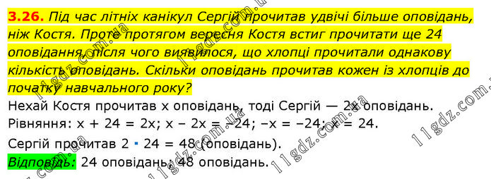 Під час літніх канікул Сергій прочитав удвічі більше оповідань, ніж Костя. Проте протягом вересня Костя встиг прочитати ще 24 оповідання, після чого виявилося, що хлопці прочитали однакову кількість оповідань. Скільки оповідань прочитав кожен із хлопців до початку навчального року? Нехай Костя прочитав х оповідань, тоді Сергій — 2х оповідань. Рівняння: х + 24 = 2х; х – 2х = –24; –х = –24; х = 24. Сергій прочитав 2 ∙ 24 = 48 (оповідань). Відповідь: 24 оповідань; 48 оповідань.