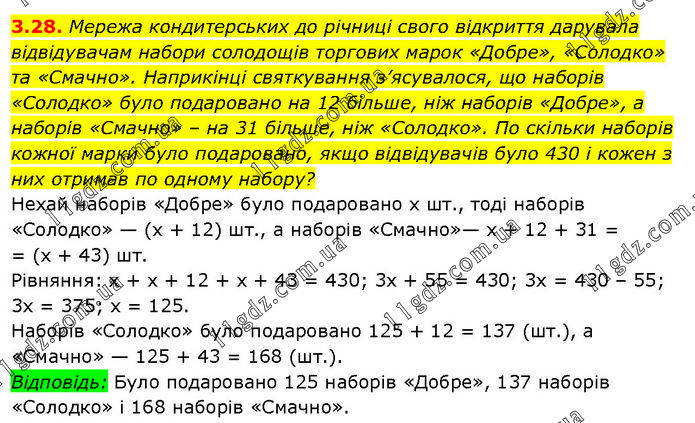Мережа кондитерських до річниці свого відкриття дарувала відвідувачам набори солодощів торгових марок «Добре», «Солодко» та «Смачно». Наприкінці святкування з’ясувалося, що наборів «Солодко» було подаровано на 12 більше, ніж наборів «Добре», а наборів «Смачно» – на 31 більше, ніж «Солодко». По скільки наборів кожної марки було подаровано, якщо відвідувачів було 430 і кожен з них отримав по одному набору? Нехай наборів «Добре» було подаровано х шт., тоді наборів «Солодко» — (х + 12) шт., а наборів «Смачно»— х + 12 + 31 = = (х + 43) шт. Рівняння: х + х + 12 + х + 43 = 430; 3х + 55 = 430; 3x = 430 – 55; 3х = 375; х = 125. Наборів «Солодко» було подаровано 125 + 12 = 137 (шт.), а «Смачно» — 125 + 43 = 168 (шт.). Відповідь: Було подаровано 125 наборів «Добре», 137 наборів «Солодко» і 168 наборів «Смачно».