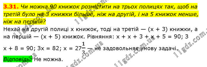 Чи можна 90 книжок розмістити на трьох полицях так, щоб на третій було на 3 книжки більше, ніж на другій, і на 5 книжок менше, ніж на першій? Нехай на другій полиці х книжок, тоді на третій — (х + 3) книжки, а на першій — (х + 5) книжок. Рівняння: х + х + 3 + х + 5 = 90; З х + 8 = 90; Зх = 82; х = 271/3 — не задовольняє умову задачі. Відповідь: He можна.