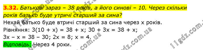 Батькові зараз – 38 років, а його синові – 10. Через скільки років батько буде утричі старший за сина? Нехай батько буде втричі старший за сина через х років. Рівняння: 3(10 + х) = 38 + х; 30 + Зх = 38 + х; Зх – х = 38 – 30; 2х = 8; х = 4. Відповідь: Через 4 роки.