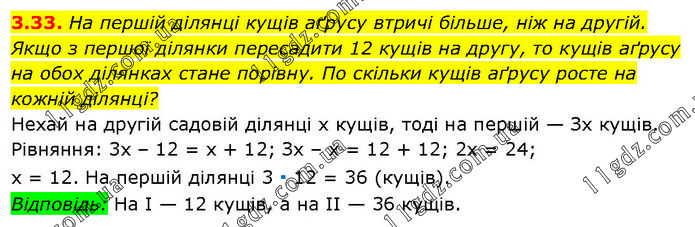 На першій ділянці кущів аґрусу втричі більше, ніж на другій. Якщо з першої ділянки пересадити 12 кущів на другу, то кущів аґрусу на обох ділянках стане порівну. По скільки кущів аґрусу росте на кожній ділянці? Нехай на другій садовій ділянці х кущів, тоді на першій — Зх кущів. Рівняння: 3х – 12 = х + 12; Зх – х = 12 + 12; 2х = 24; х = 12. На першій ділянці 3 ∙ 12 = 36 (кущів). Відповідь: На І — 12 кущів, а на II — 36 кущів.