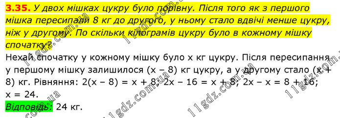 У двох мішках цукру було порівну. Після того як з першого мішка пересипали 8 кг до другого, у ньому стало вдвічі менше цукру, ніж у другому. По скільки кілограмів цукру було в кожному мішку спочатку? Нехай спочатку у кожному мішку було х кг цукру. Після пересипання у першому мішку залишилося (х – 8) кг цукру, а у другому стало (х + 8) кг. Рівняння: 2(х – 8) = х + 8; 2х – 16 = х + 8; 2х – х = 8 + 16; х = 24. Відповідь: 24 кг.