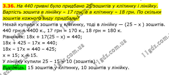 На 440 гривні було придбано 25 зошитів у клітинку і лінійку. Вартість зошита в лінійку – 17 грн, а в клітинку – 18 грн. По скільки зошитів кожного виду придбали? Нехай купили х зошитів у клітинку, тоді в лінійку — (25 – х ) зошитів. 440 грн = 4400 к., 17 грн = 170 к., 18 грн = 180 к. Рівняння: 18х + 17(25 – х) = 440; 18х + 425 – 17х = 440; 18х – 17х = 440 – 425; x = 15; х = 15. У лінійку купили 25 – 15 = 10 (зошитів). Відповідь: 15 зошитів у клітинку, 10 зошитів у лінійку.
